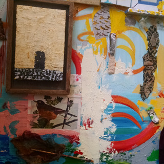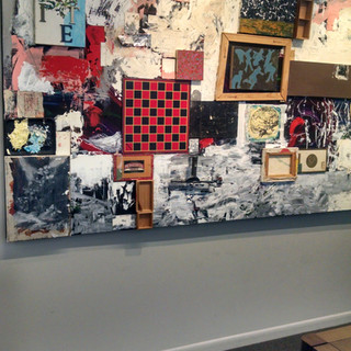 Michael Pauker’s “Reckless Wrecks and Reclaimed Reliquaries”, on exhibit at the Branner-Spangenberg Gallery until September 15, 2017 [opening reception: Friday, September 8; 5:30-8:30 P.M.], meets the viewer with four monumental works in progress, wall-size paintings with a variety of objects, ranging from painted-over brushes, tubes and other artists’ supplies to cigar boxes, household supplies, and other canvases, often facing backwards and inscribed with notes and sketches. A few smaller images, similarly utilizing plywood and other materials, are also displayed, and a tackle box with fisherman’s gear and a plaster life mask of the artist round out the exhibit.